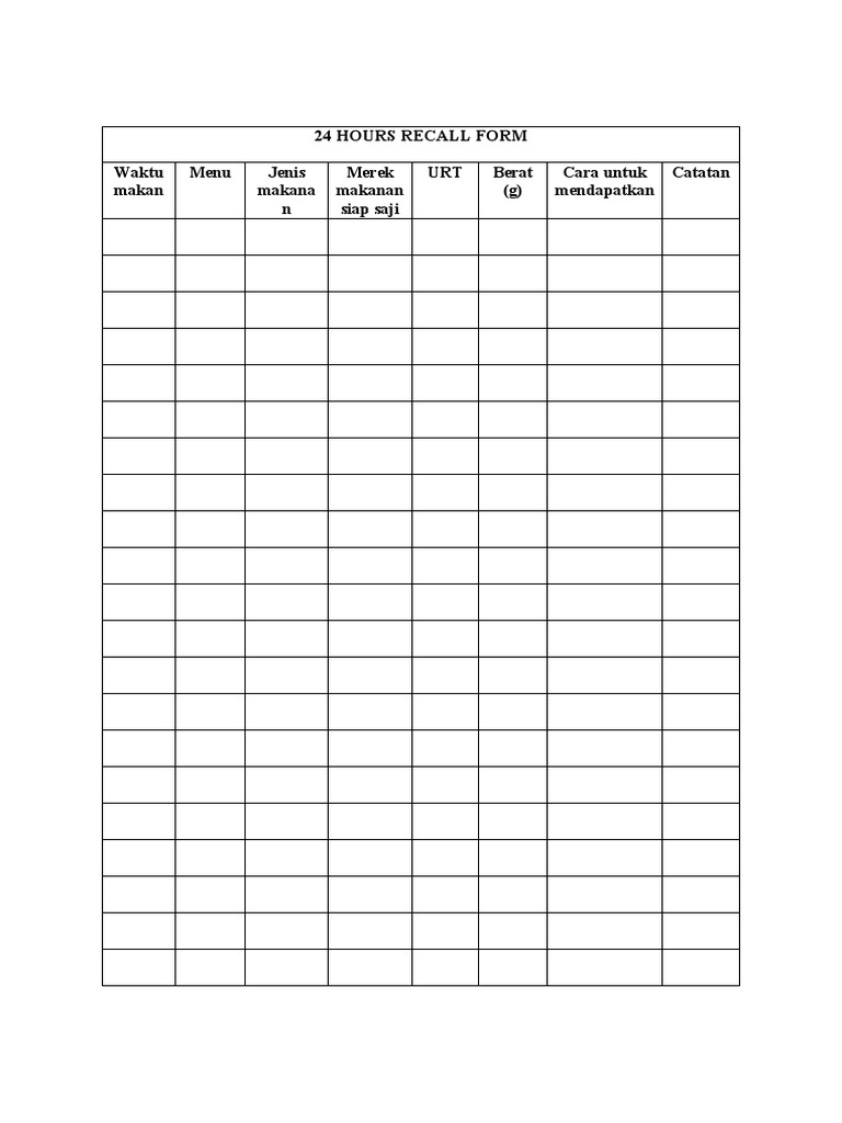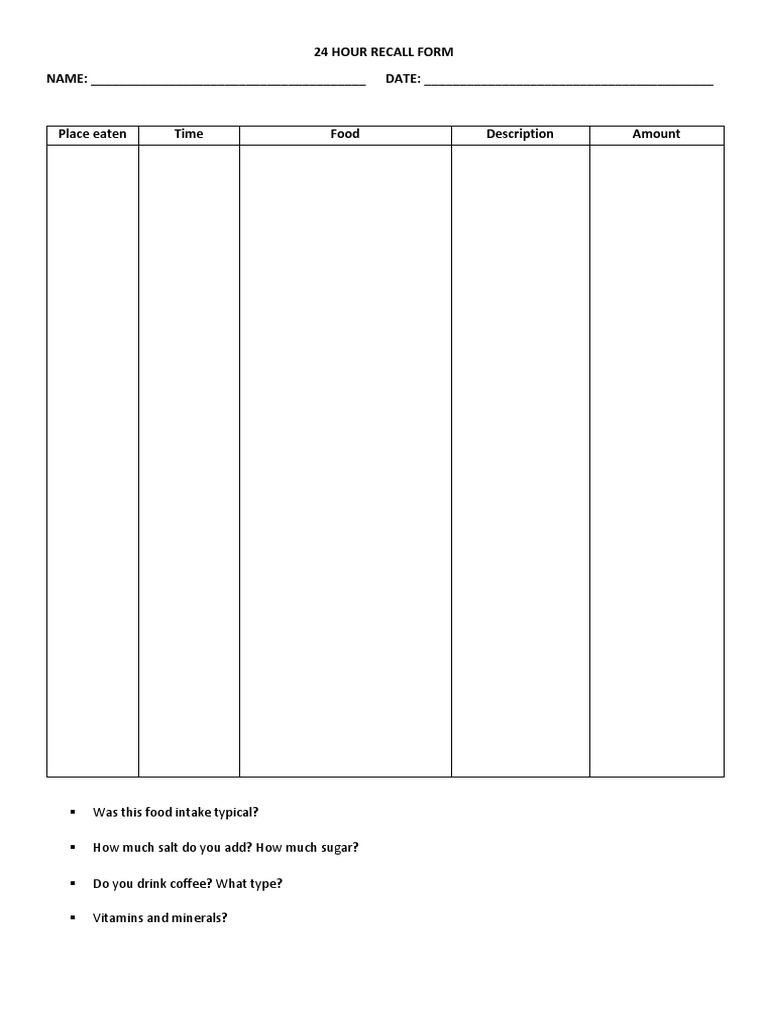 24 Hour Recall Form - Exact amounts of food groups vary according to gender, age, and activity level. See www.choosemyplate.gov for a customized food. Please write down everything you ate and drank (including all meals, snacks, drinks, “nibbles”, sweets, etc.) in the last 24 hours,.