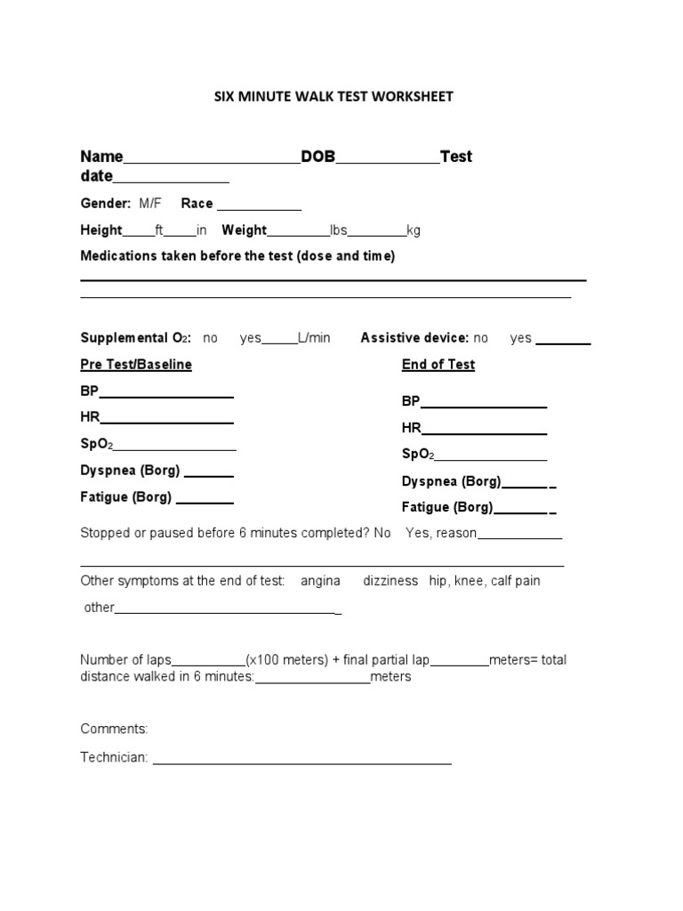 6 Minute Walk Test Form - “the aim of this test is to walk as far as possible for 6 minutes. Page 1 of 1 6 minute walk test number of laps distance of incomplete lap (m) visit #: Rate of perceived dyspnea 0 not at all 1 very slight 2 slight 3 moderate 4 somewhat hard 5 severe 6 7 very severe 8 9 10 very, very severe Find out the suggested equipment,. You have 5 minutes to go. Learn how to conduct and score the 6mwt, a simple and reliable test of functional exercise capacity. You will walk along this hallway between the pylons as many times as you can.