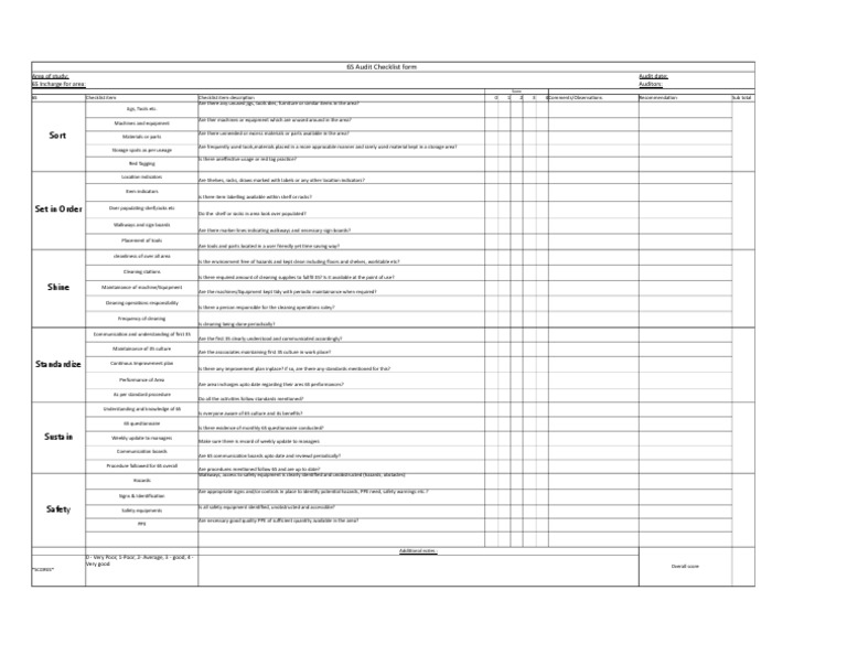 Use this template periodically to inspect the quality and safety practices in. A 6s audit is basically a 5s audit with extra attention to safety.