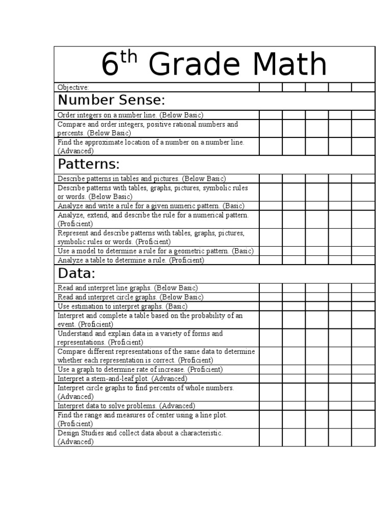 6Th Grade Math Skills Checklist