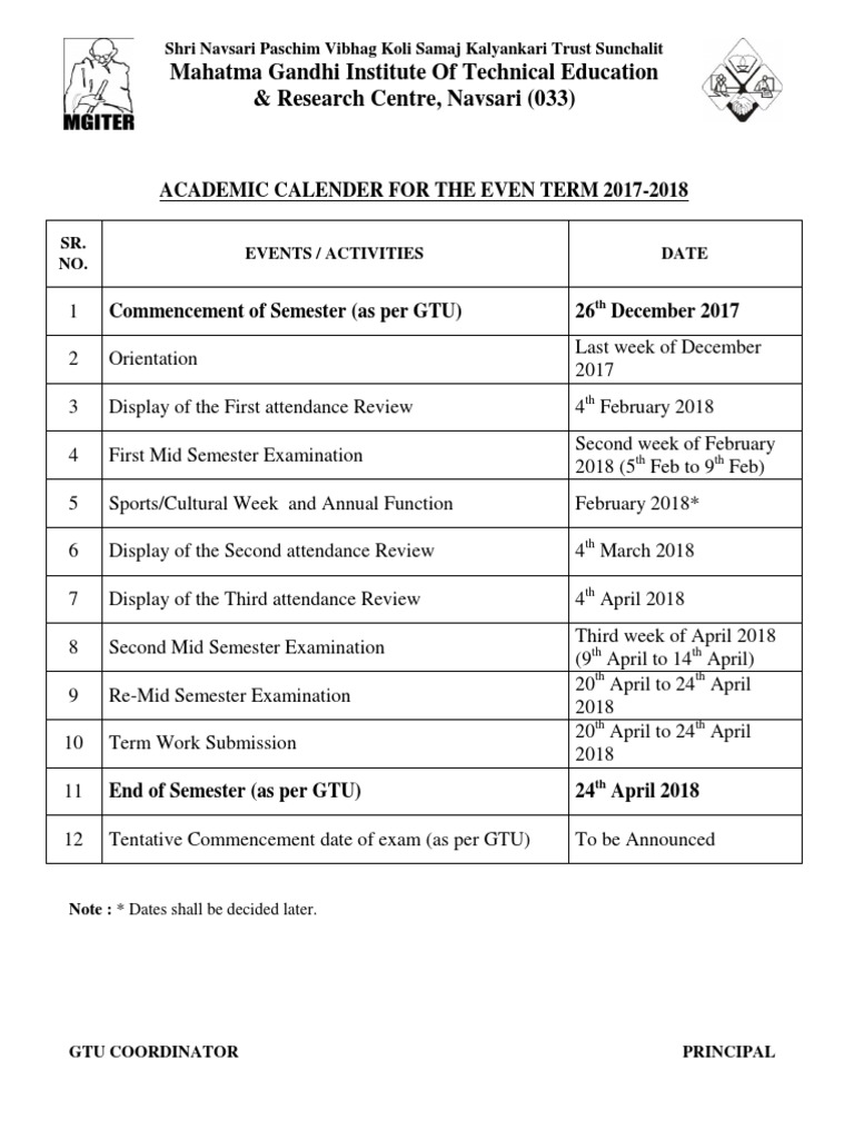 Academic Calender For The Even Term 20172018 PDF