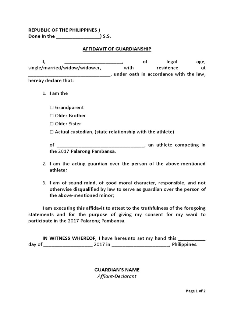 A guardianship affidavit is a legal document that grants a person temporary legal rights to another person in the absence of a parent or caregiver. If you are a witness or petitioner in a guardianship proceeding, you may need to file an affidavit explaining why the person needs a guardian or. An affidavit of guardianship is a written statement in which a person is declared as the official guardian. 100k+ visitors in the past month What is an affidavit of guardianship?