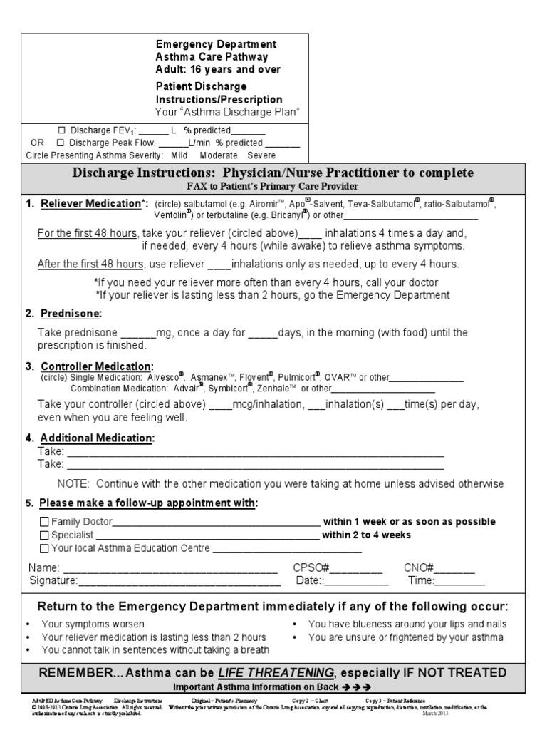 Make an asthma action plan with your doctor that you can follow every day to keep your asthma under control. Most people with asthma do not get so. The flare plan is a comprehensive and concise tool to help patients receive discharge instructions based on the naepp guidelines for. When you are discharged following an asthma attack, you will need more reliever medication than when you are well.