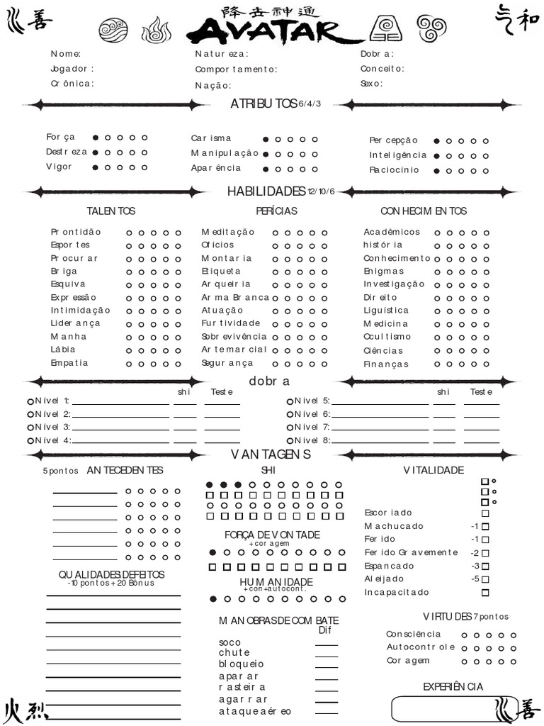 Hey, if you're like me you want to play the new avatar ttrpg with friends, but know no one in person who wants to do so and there is no easy. I went through and made form fillable versions of the character sheets for my players since many of them prefer having a digital character sheet and. Interactive version by.
