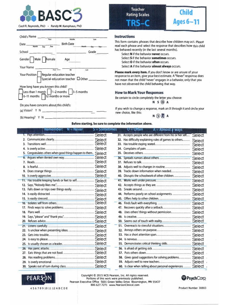 What will the student observation system (sos) provide?. Behavior assessment system for children, third edition 2015 uses a comprehensive set of rating scales and forms to help. Teacher rating scale (trs) form: