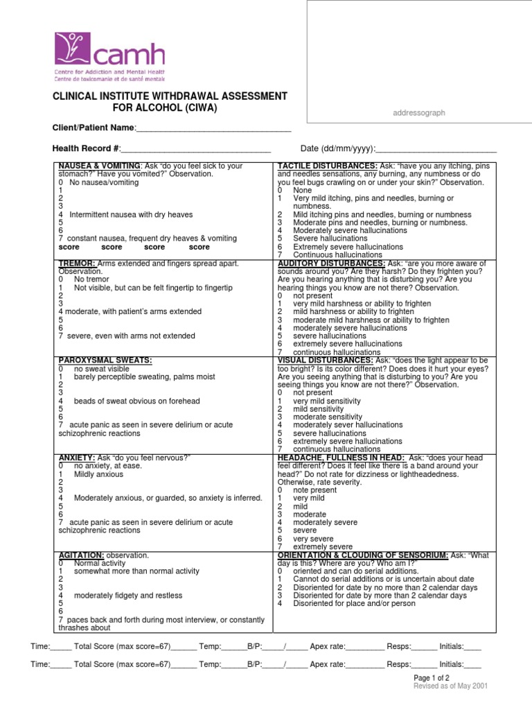 Ciwa Scoring Sheet - Scores of less than 8 to 10 indicate minimal to mild withdrawal. A score of 15 + points means the patient may be at increased risk of alcohol withdrawal. Alcohol withdrawal can lead to poor patient outcomes including death if not assessed and managed properly. This clinical tool assesses 10 common withdrawal signs. Maximum possible score=67 patients scoring less than 10 do not usually need additional medication for withdrawal. A study of the revised version of the ciwa predicted that those with a score of >15 were at increased risk for severe alcohol withdrawal. Scores of 8 to 15 indicate moderate withdrawal (marked autonomic.