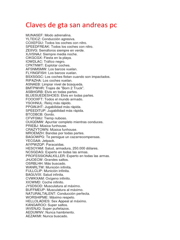 Claves Para Gta San Andreas En Pc