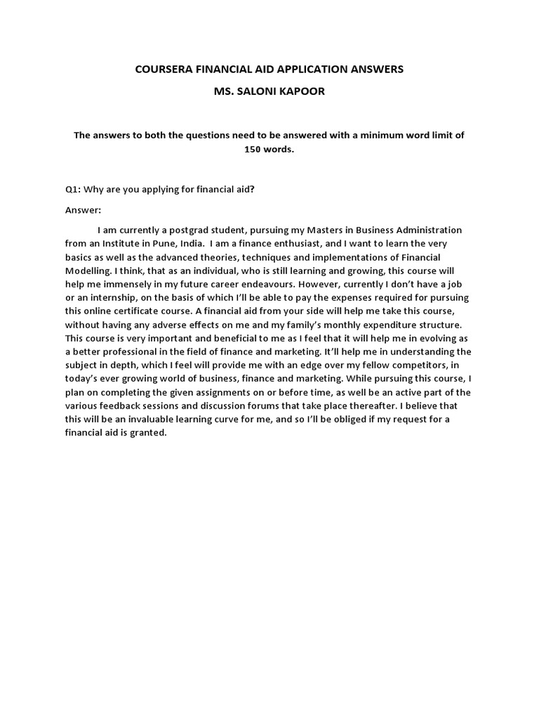 Coursera financial aid sample answers: However, all applications are not. Coursera financial aid application example responses. Find answers to frequently asked financial aid questions.