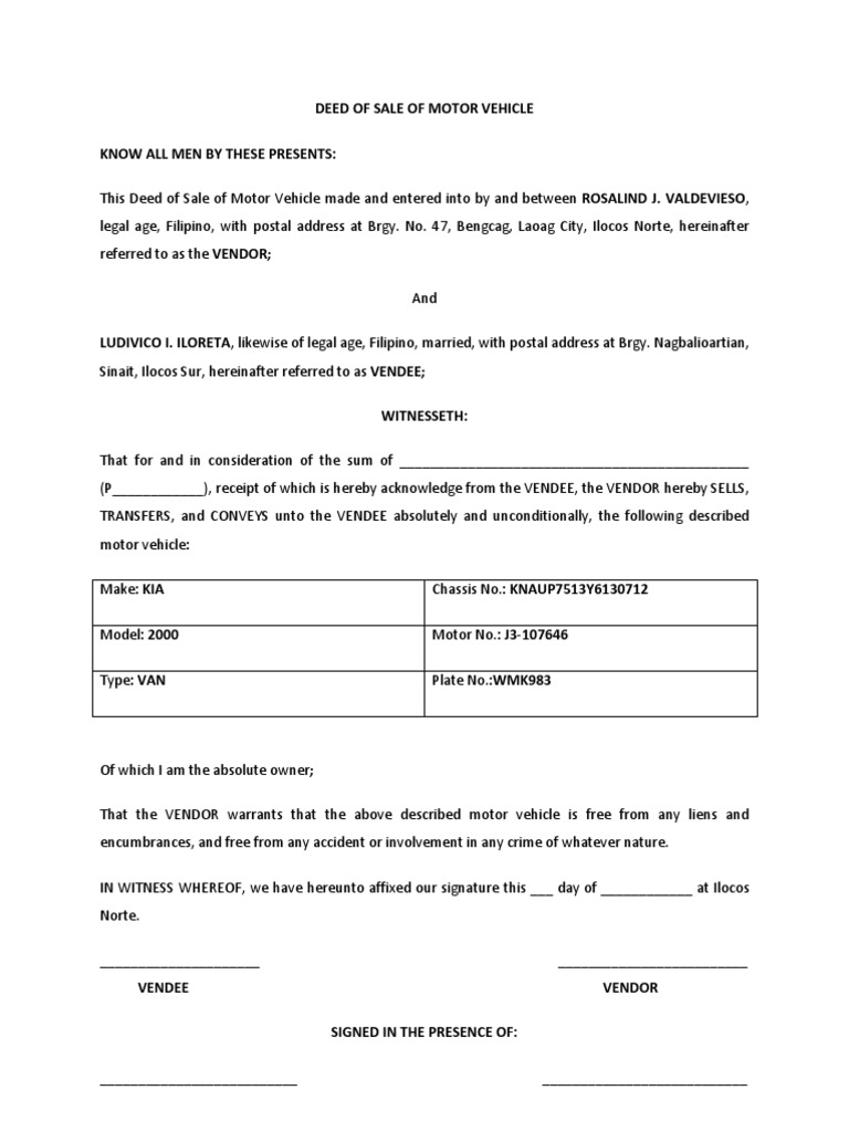 Deed of Sale Blank PDF Motor Vehicle Automobiles