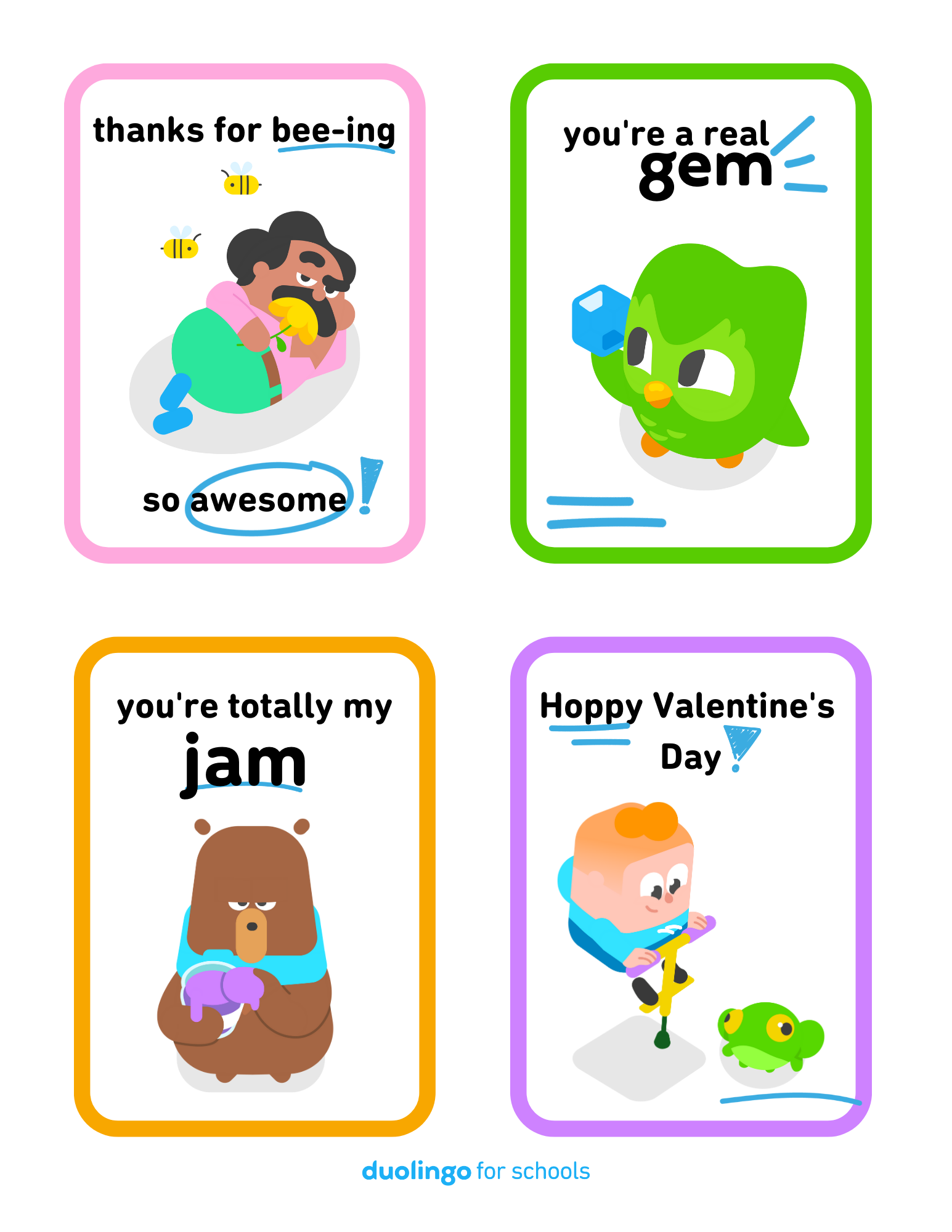 Duolingothemed Valentine's Day cards Duolingo for Schools