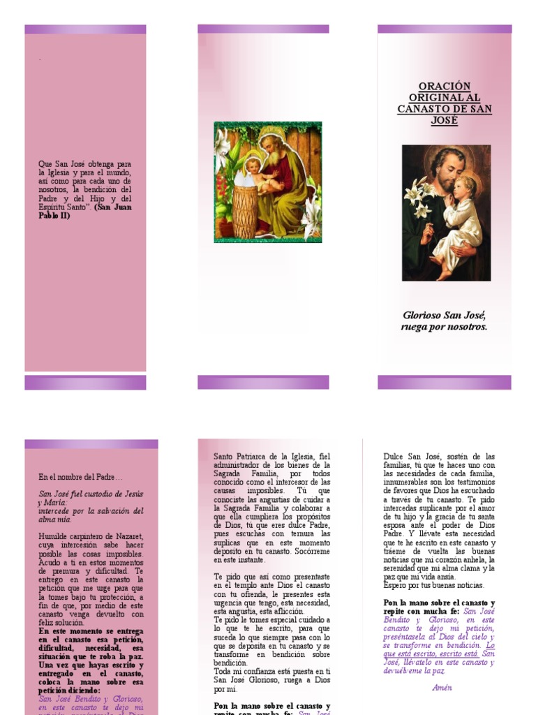 La oración del canasto de san josé es una devoción popular que se encuentra en muchos países de habla hispana. Dulce san josé, sostén de las familias, tú que te haces uno con las necesidades de cada familia, innumerables son los testimonios de favores que. Se cree que esta oración. Oh, san josé, no me canso nunca de contemplarte ya.