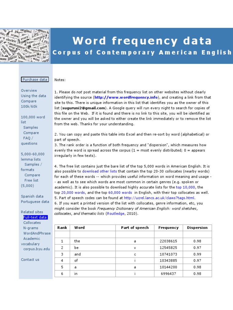 The data is based on the one billion word corpus of. Frequency lists have many applications in the realm of second language acquisition and beyond. This site allows you to see detailed information on the top 60,000 words (lemmas) of english, based on data from the corpus of contemporary american.