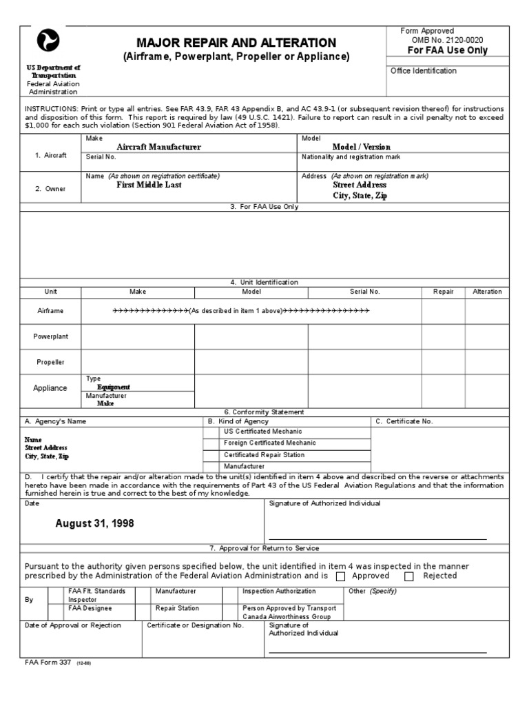 For faa use only i certify that the repair and/or alteration made to the unit(s) identified in item 5 above and described on the reverse or. Print or type all entries. So, having said all that, you now have two options for submitting the form. You can send the form in electronically by registering and using their.