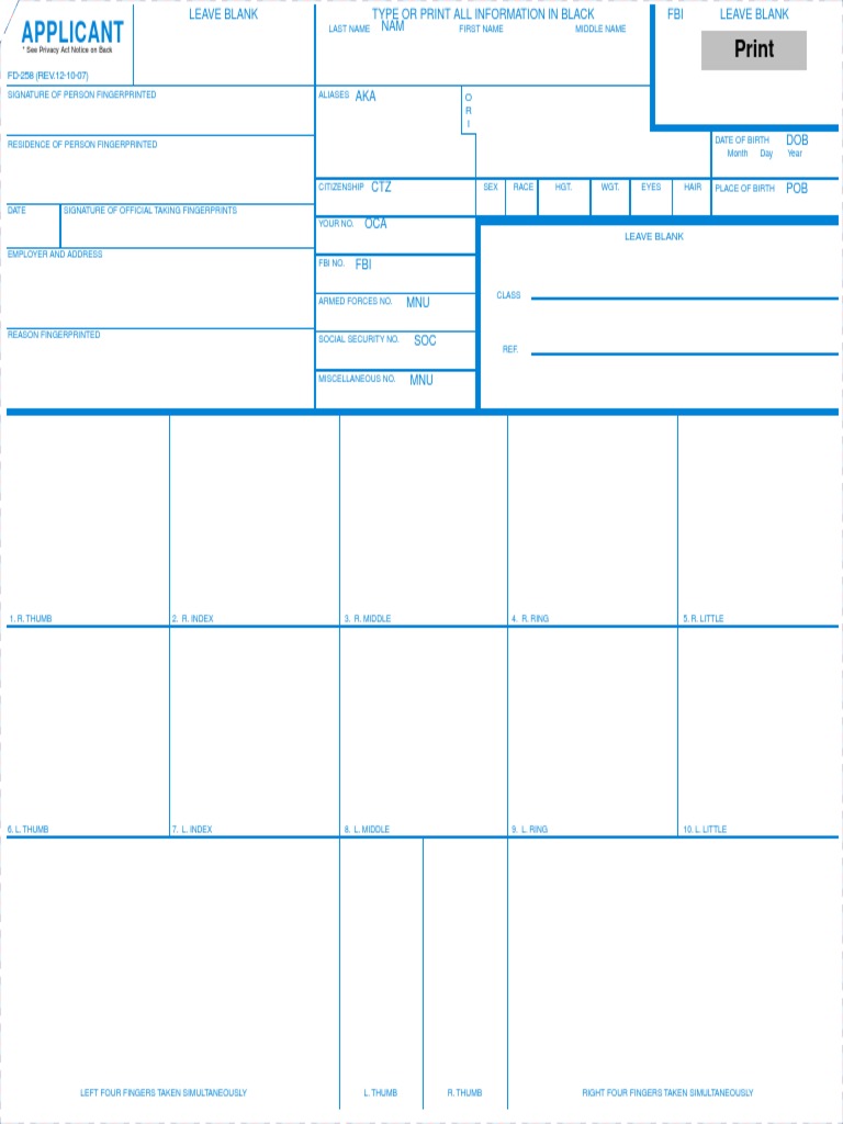 Fbi Applicant Fingerprint Card Form Fd 258 Form Resume Examples