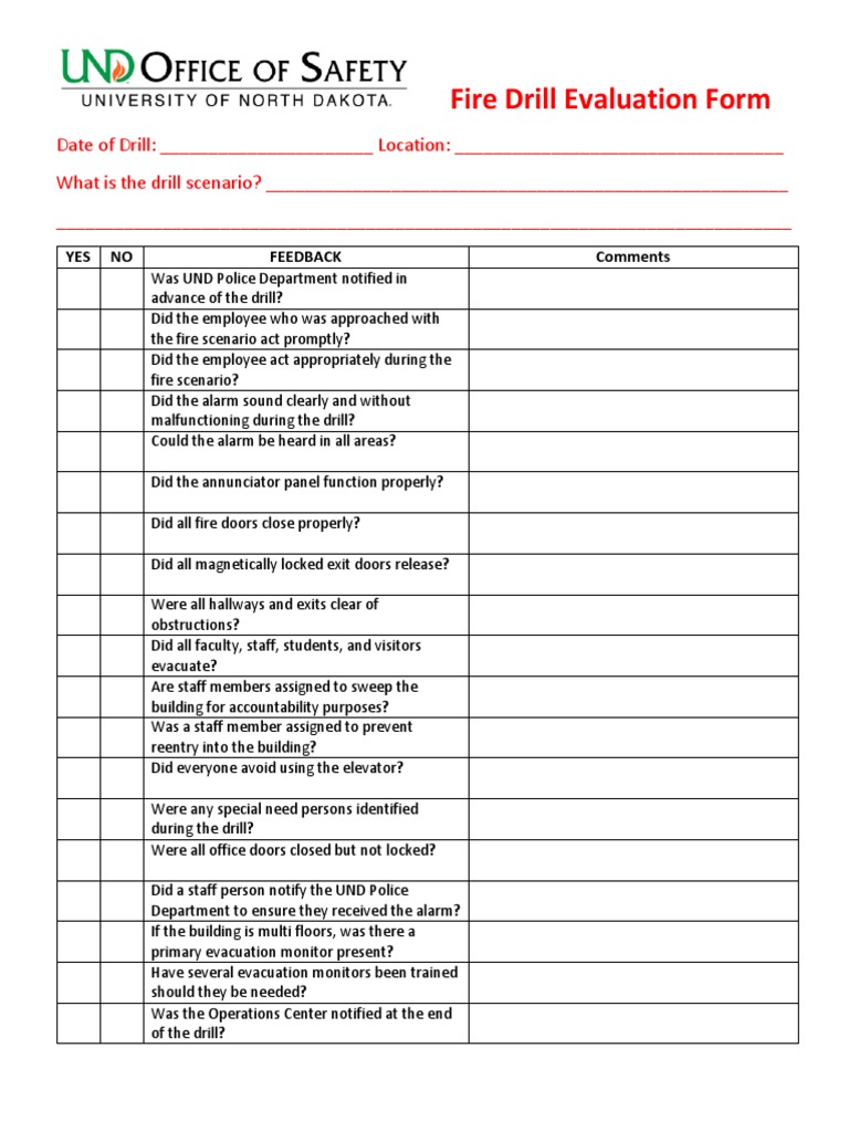 Total time of evacuation (row 4 time minus row 1 time) did anyone refuse to. Did the employee act appropriately during the fire scenario? Which floors participated in the fire evacuation drill. Please forward a copy of this completed form to the jsu police department, 700 pelham road north jacksonville, al 36265. Using a fire drill feedback form allows you.