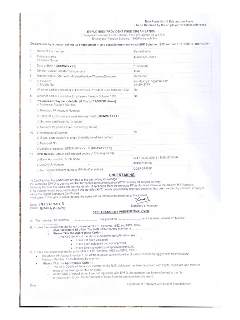 Fillable Online PF Declaration Form (Form 11) SAMPLE FORM