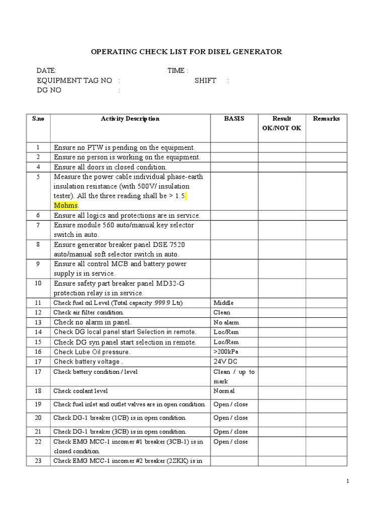 Diesel Generator Checklist PDF Switch Electrical Equipment