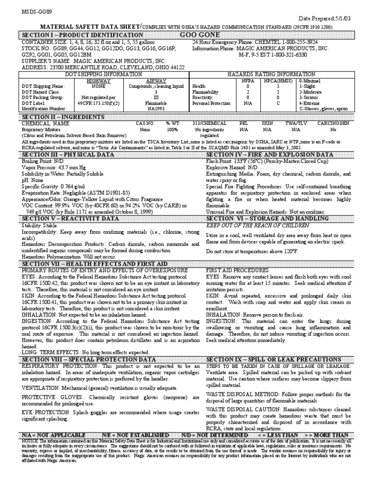 Goo Gone Liquid GG89 MSDS PDF Fires Volatile Organic Compound