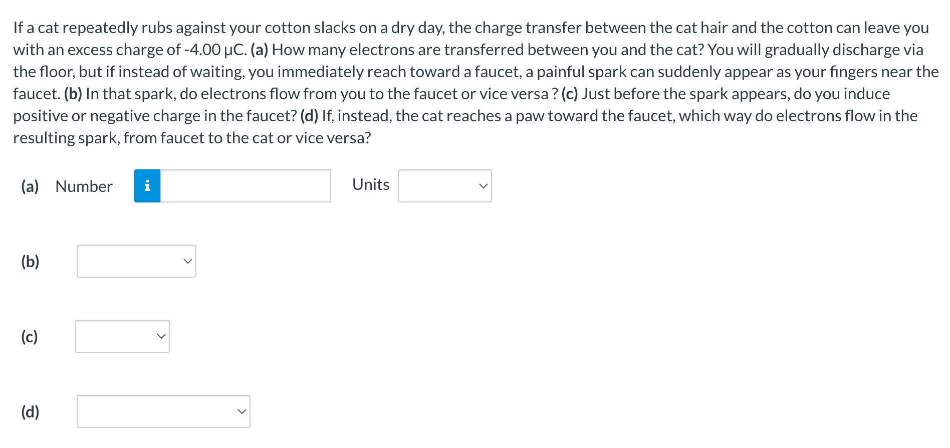 If the cat with a positive charge reaches out, electrons flow from the faucet to the cat. If a cat repeatedly rubs against your cotton slacks on a dry day, the charge transfer between the cat hair and the cotton can leave you with an. The electron transfer due to cat rubbing against your cotton pants is around 1.75 x.