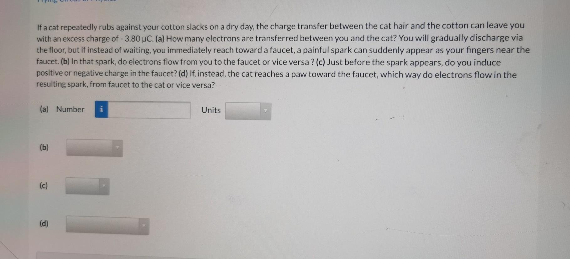 The electron transfer due to cat rubbing against your cotton pants is around 1.75 x 10^13 electrons. If a cat repeatedly rubs. If the cat with a positive charge reaches out, electrons flow from the faucet to the cat. If a cat repeatedly rubs against your cotton slacks on a dry day, the charge transfer between the cat hair and.