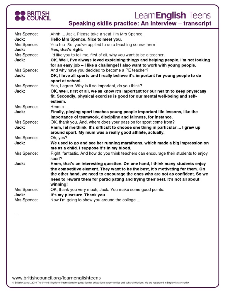 Speaking skills practice An interview transcript Physical