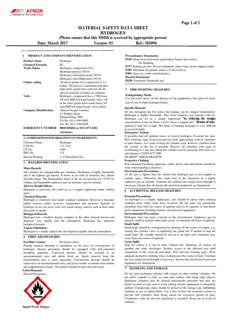 Code of federal regulations 29 cfr 1910.1200, hazard. 03 page 1 of 11 section 1: Safety data sheet hydrogen sds no.: Safety data sheet according to the united nations’ globally harmonized system (un ghs) date / revised: Material safety data sheet product name: