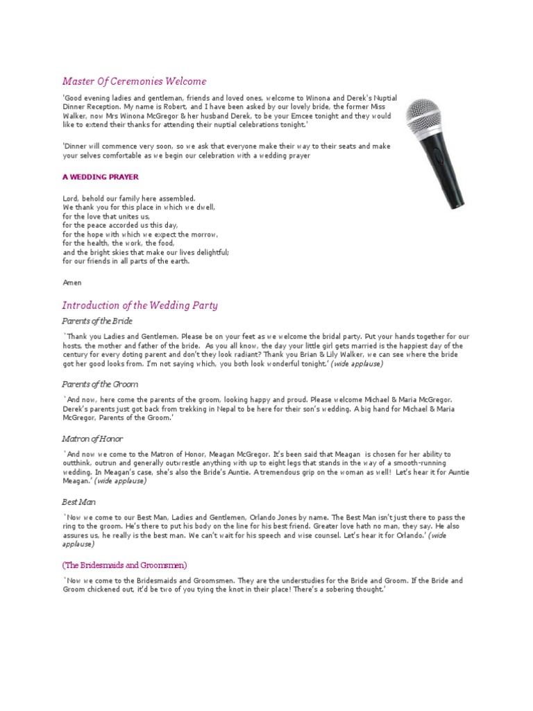 We are your hosts for the evening, i am ____, and this is ____, and we would like to welcome you to the groom surname and brides. Every wedding will be different, but i have included a general script for you to follow as you proceed throughout the night. Within this guide, we provide a sample wedding ceremony and reception.