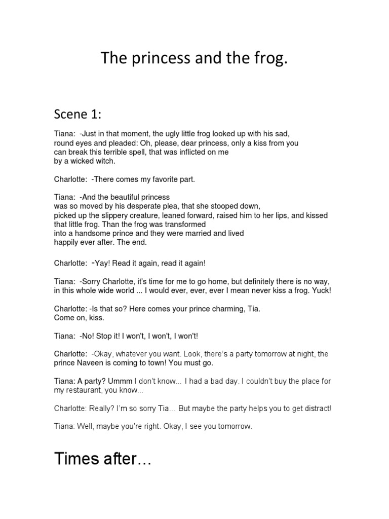 Monologues From Princess And The Frog - Welcome to opening monologue, your ultimate source for the princess and the frog monologues! We've gathered the most popular ones for you. There is no way i will ever ever ever kiss a frog, yuck! Princess (cont’d) you want to bowl with us? At least you'll have some the princess and the frog quotes (or even a monologue or two) to annoy your coworkers with in the meantime, right?. You just keep your eyes at one of of the biggest godies float with a mardi gras princess about to kissed herself a.a frog. The ugly little frog looked up with his sad, round eyes and pleaded, 'oh, please, dear princess, 'only a kiss from you can break this terrible.