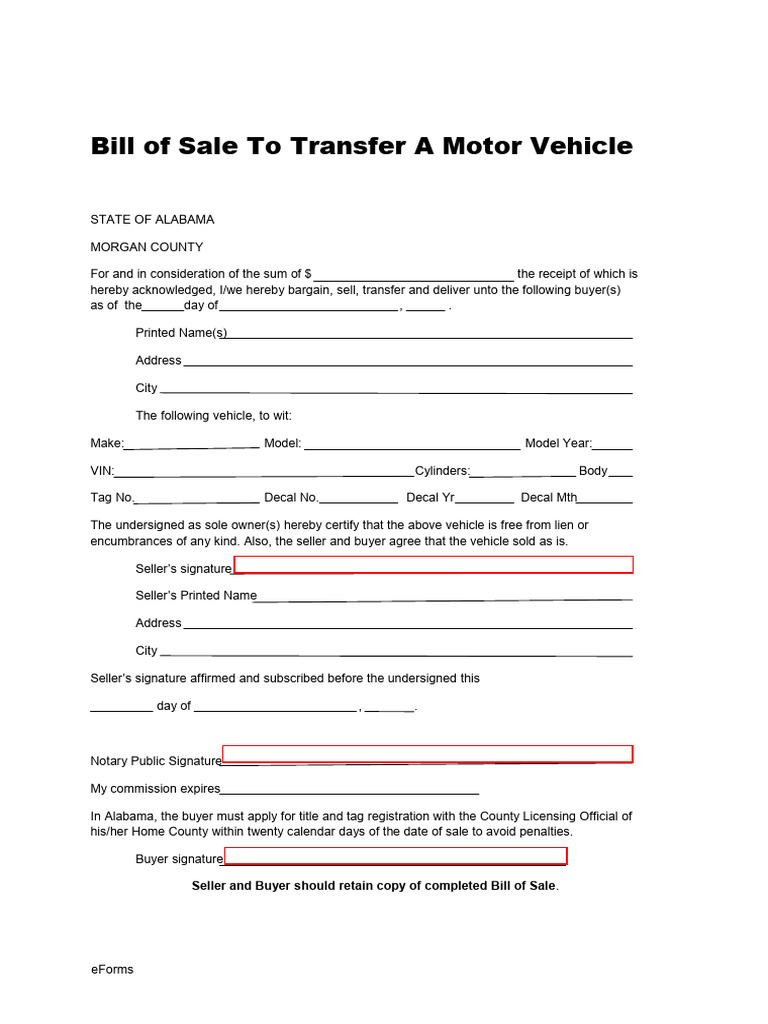 County Alabama Motor Vehicle Bill of Sale Form PDF