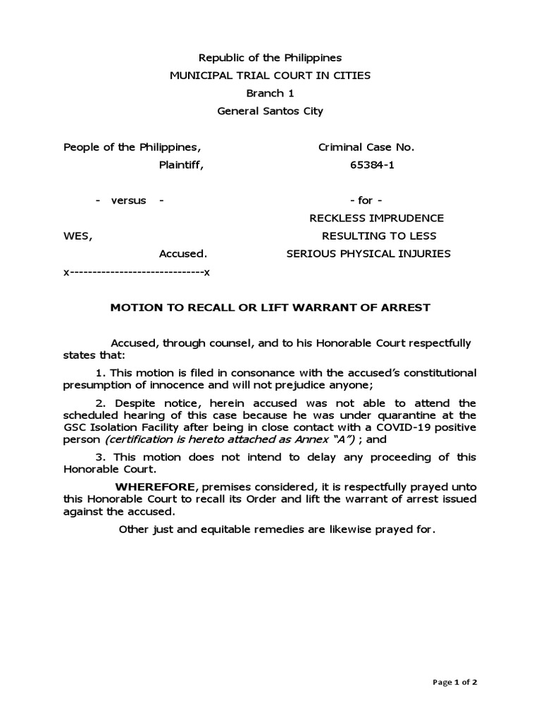 Motion To Recall or Lift Warrant of Arrest Tabingo (160317