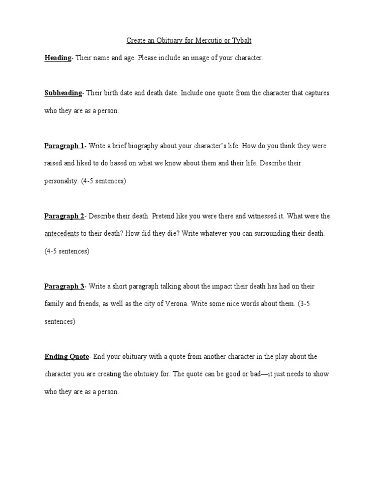 Mercutio Tybalt Obituary PDF Characters In Romeo And Juliet