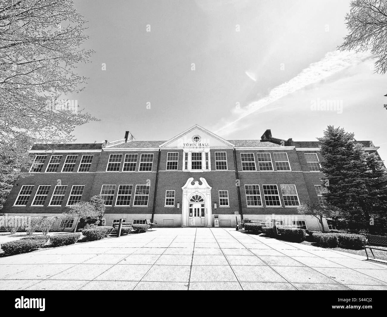 Exterior of Old Saybrook Town Hall on a sunny, spring day in Old