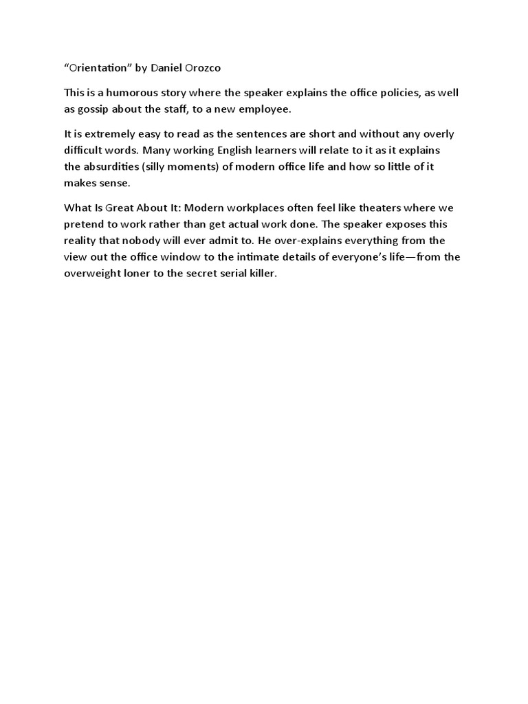 The "Orientation" Short Story by Daniel Orozco 920 Words Essay Example