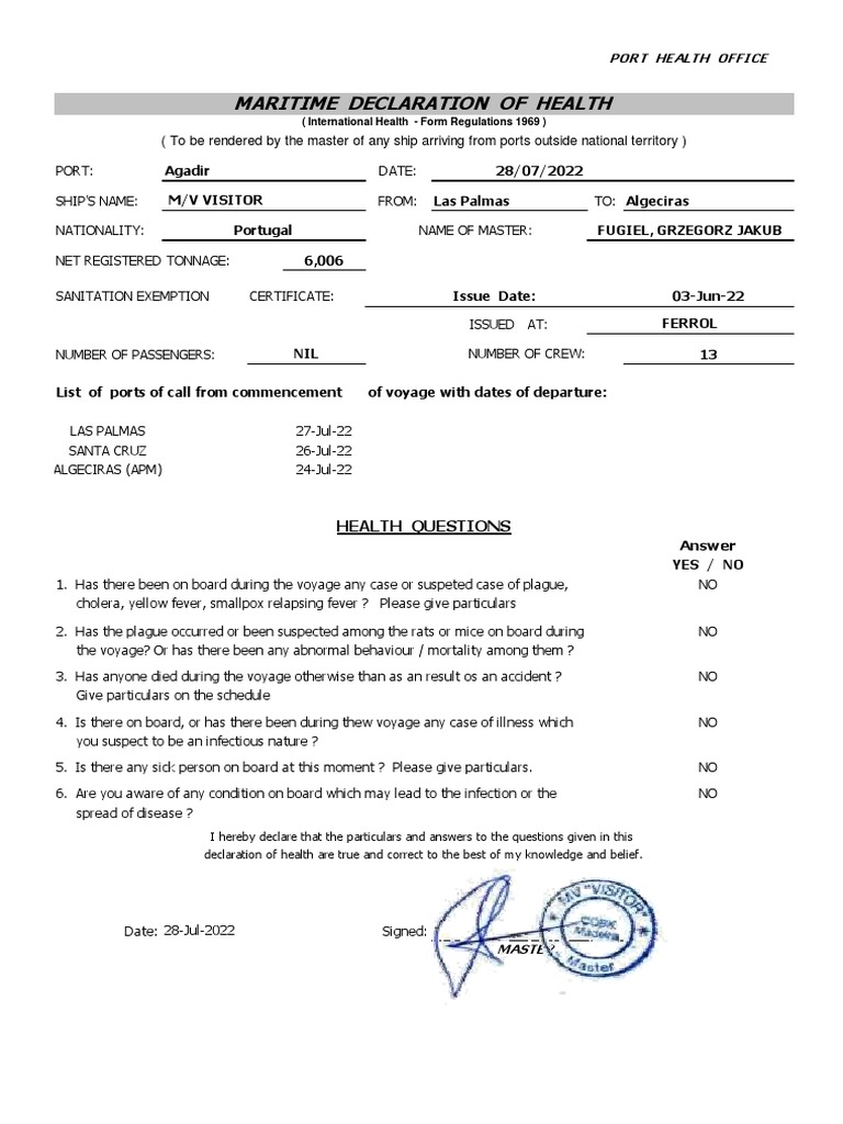 Port health services ministry of health health declaration form the nigeria health declaration form must be filled out by all. Masters of all vessels arriving into warrenpoint harbour are advised that they are required to submit a maritime declaration of health at. Model of maritime declaration of health to be completed and submitted to the competent authorities by the masters.