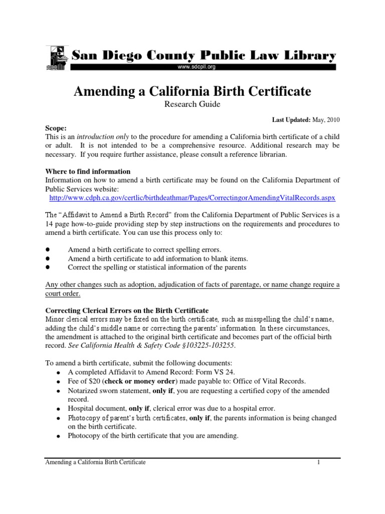 Amending a california birth record for assistance in selecting the correct birth amendment form, please utilize our birth amendment overview. In california, to amend a birth certificate, you'll need to file a request with the california department of public health (cdph). To add, remove, or replace a parent on a birth certificate, you must contact the california department of public.