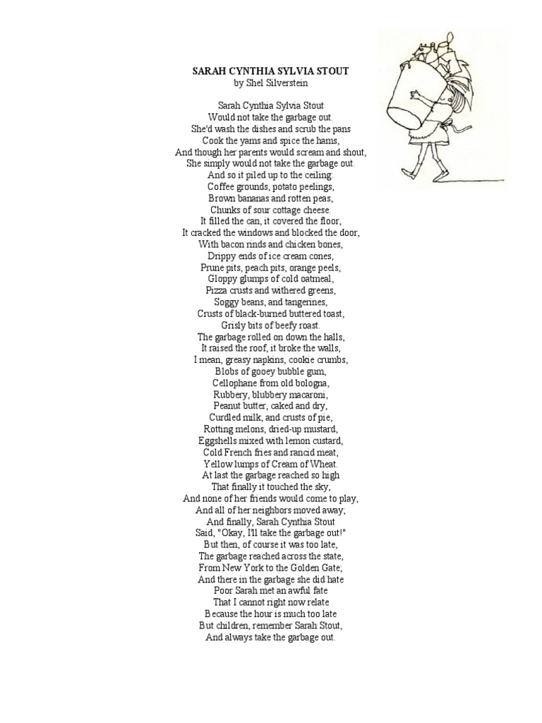 Sarah cynthia sylvia stout would not take the garbage out! She'd scour the pots and scrape the pans, candy the yams and spice the. Sarah cynthia sylvia stout would not take the garbage out! Shel silverstein would not take the garbage out! She'd scour the pots and scrape the pans, candy the yams and spice the hams, and.