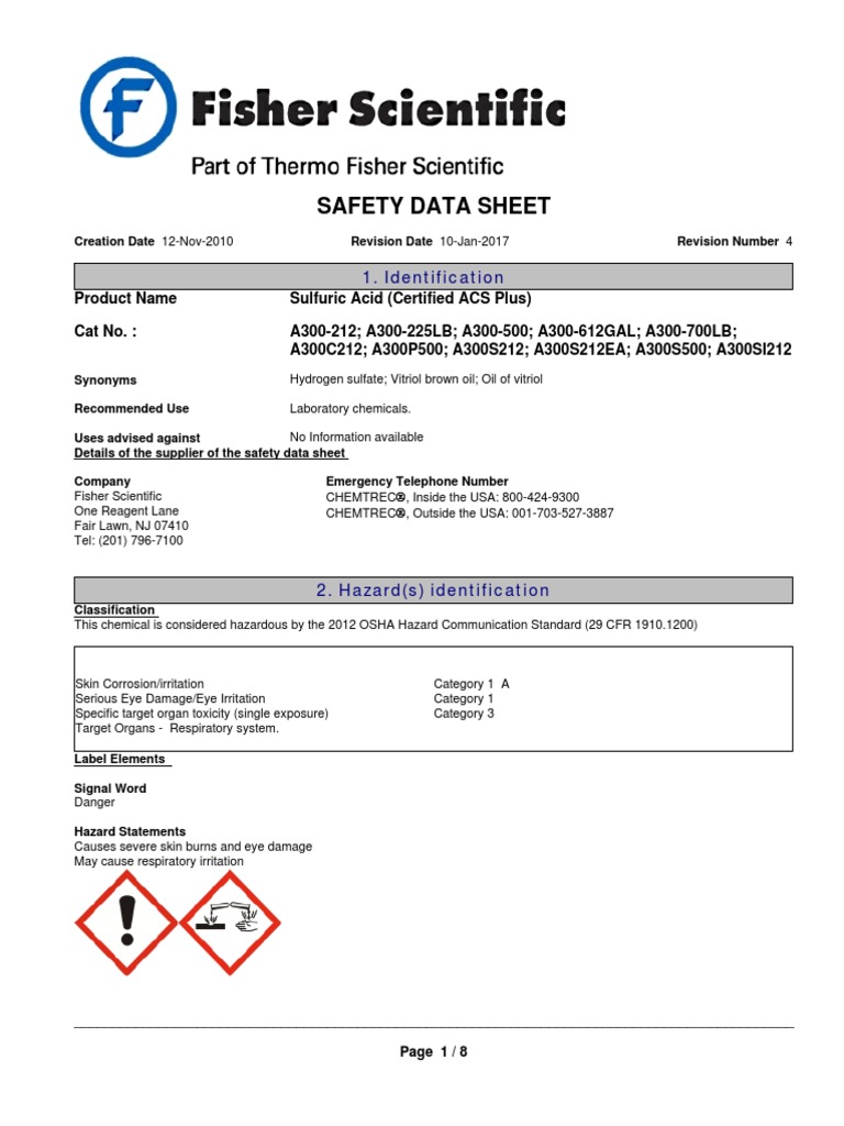 Substance classified with a health or environmental hazard. Specific treatment (see section 4 on this label) immediately call a poison center or doctor/physician if in eyes: Safety data sheet sulfuric acid 93% 66be° version 1.4 revision date: Safety data sheet according to the (us) hazard communication standard (29 cfr 1910.1200) revision date: Substance with a workplace exposure limit.