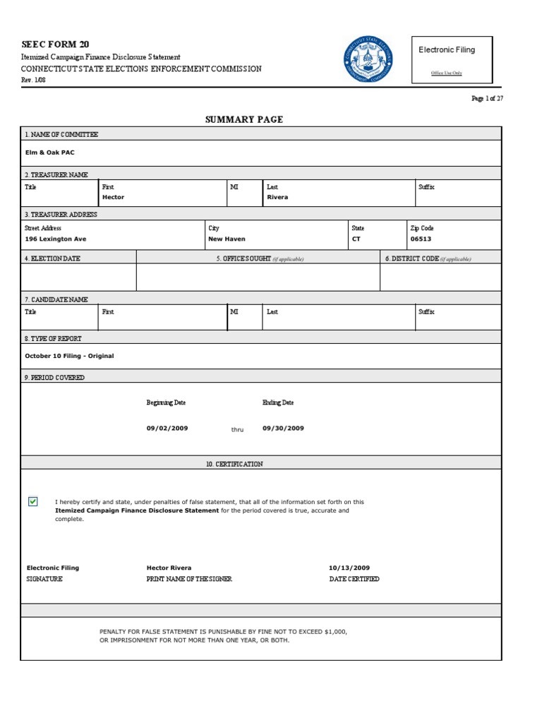 Explore ct seec form 20 line by line here. Easily complete your connecticut itemized campaign finance disclosure statement with accurate. Seec form 20 itemized campaign finance disclosure statement ecris enables campaign treasurers of party committees and. Cash personal check credit/debit card cash personal check. Seec form 20 itemized campaign finance disclosure statement connecticut state elections enforcement commission do.