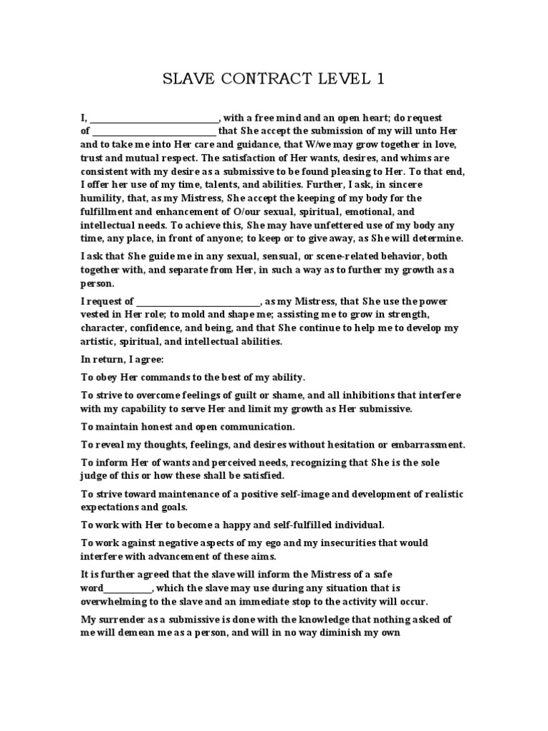 1 slave contract templates are collected for any of your needs. View, download and print a consensual real slavery contract between a slave and its master pdf template or form online. No need to install software, just go to dochub, and sign up instantly and for free. It defines the roles and responsibilities of the slave, who agrees to submit completely to the master. Edit, sign, and share slave contract online. Create a legally binding master slave consensual real slavery contract with our free template. Fill it online, save as pdf, or download it as a blank pdf or word document. It establishes the master's total control over the slave without consideration for the.