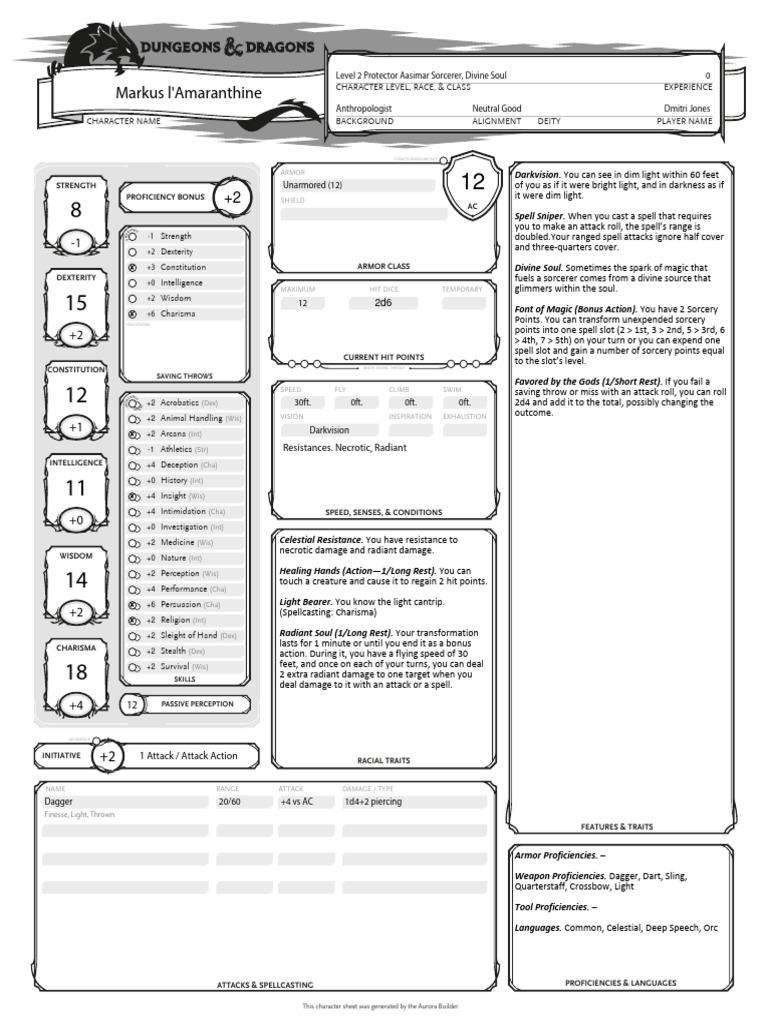 D&D Character Sheet (Marks L'amaranthine LVL2) PDF