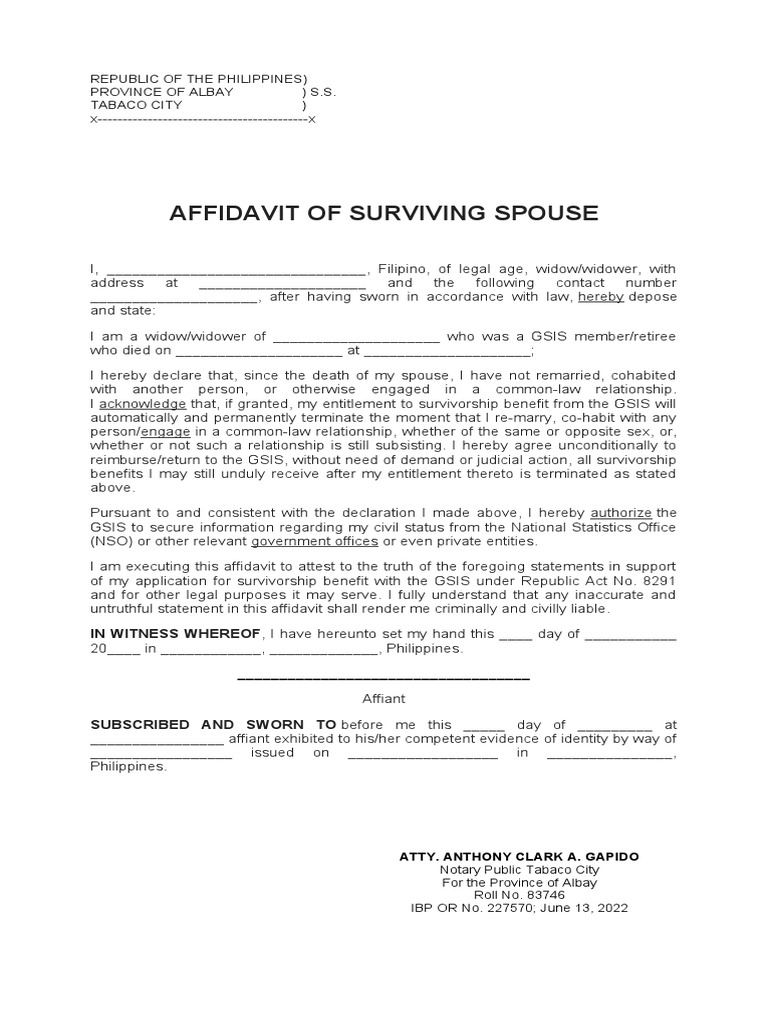 AFFIDAVIT of SURVIVING SPOUSE or Form Fill Out and Sign Printable PDF