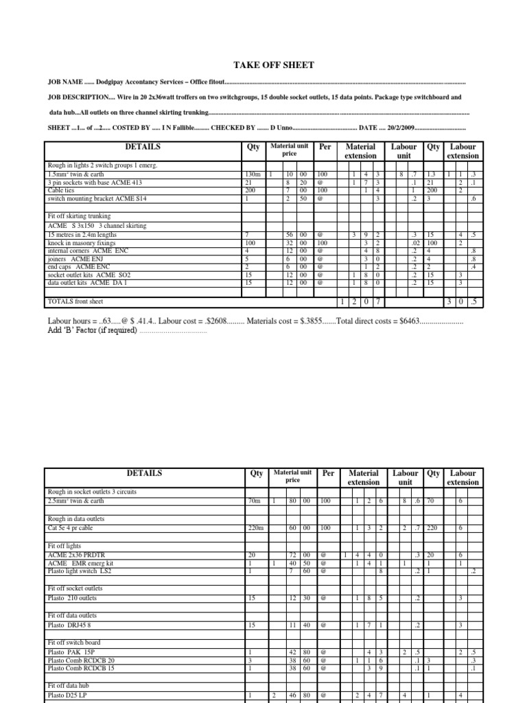 Take Off Sheet Template SampleTemplatess SampleTemplatess