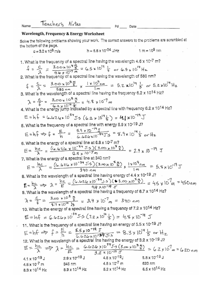 Wavelength Frequency and Energy Worksheet Answers