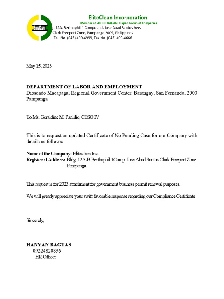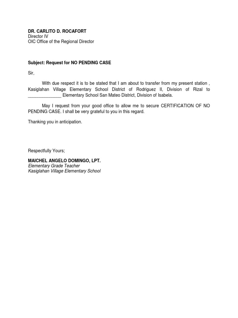 Request Letter For Dole No Pending Case PDF