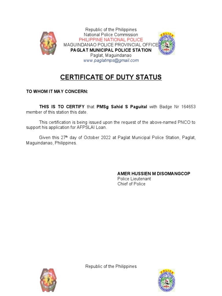 Certification of Duty Status & NonPending Case (PSSG Nestor E Alilaya